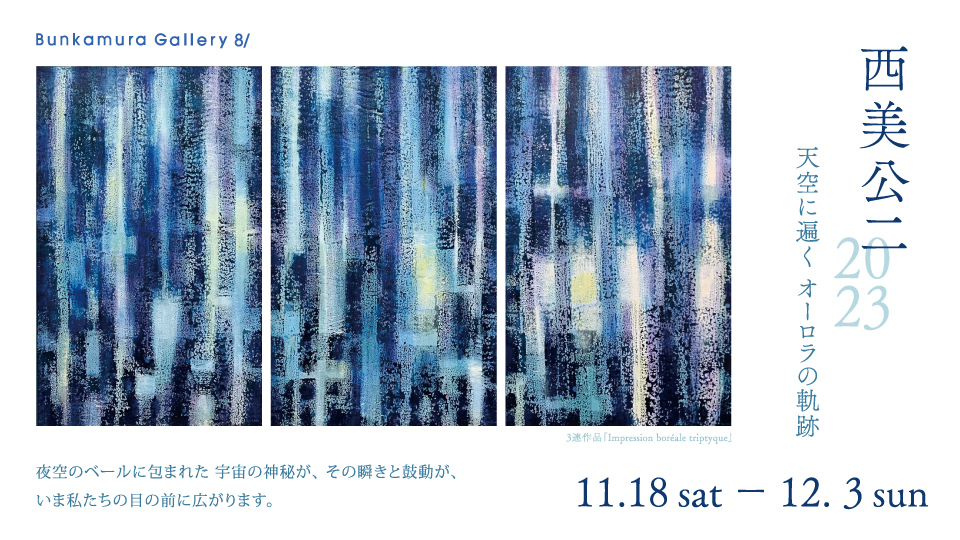 天地万物の神秘を描き続ける画家 西美公二。1981年に渡仏しパリにアトリエを構えた西美は、近年ノルウェーやフィンランドなど北半球の最果てを巡り、毎年のようにオーロラを取材。ラスコー洞窟の壁画や、ノルウェー最北部に位置するアルタの岩絵に描かれた太古の痕跡にさらなる感銘を受け、そのあくなき探求心は刺激され続けています。