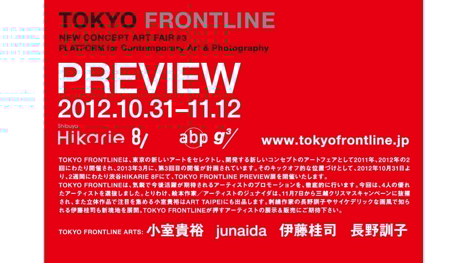 TOKYO FRONTLINEは、東京の新しいアートをセレクトし、開発する新しいコンセプトのアートフェアとして2011年、2012年の2回にわたり開催され、2013年3月に、第3回目の開催が計画されています。そのキックオフ的な位置づけとして、2012年10月31日より、2週間にわたり渋谷HIKARIE 8Fにて、TOKYO FRONTLINE PREVIEW展を開催いたします。