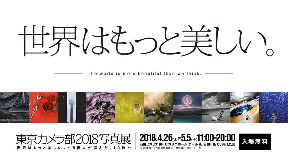 2017年に東京カメラ部とその分室で8億人*を超える人々が総計約600万作品の中から選んだ10作品「10選2017」を中心に新作、自信作を追加。更に2012年からの10選メンバーを加えた、10選6世代による合同展示、アサヒカメラ×東京カメラ部共催「日本の47枚」写真コンテスト作品と東京カメラ部2018写真コンテストInstagram部門を加えた、約1,200作品をヒカリエ9F「ヒカリエホール ホールB」で展示します。