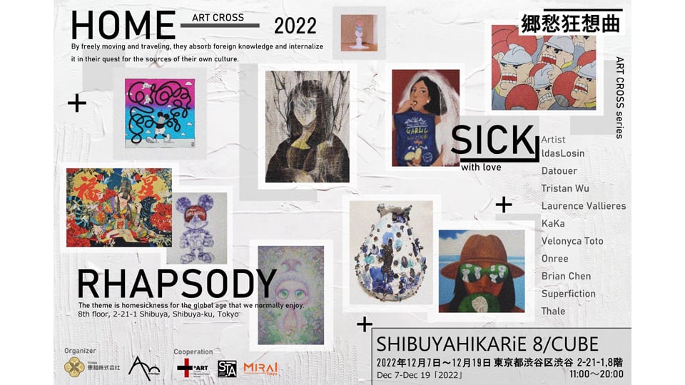 ポストコロナ初、国際的なキュレーターである「ART CROSS」が主催する現代美術グループ展「郷愁狂想曲(ホームシックラプソディー)」は、主に美術館所蔵レベルのアジア系やヨーロッパ系のアーティストたちと、新鋭で日本またグローバル的素晴らしい販売実績を上げたトレンドアーティストたちが揃って、世界各国の国境規制緩和後初の東京での美の対話プラットホームを作ります。渋谷ヒカリエ8/にてイダス・ローシン(IdasLosin)、ダトゥール(Datouer)、トリスタン・ウー(TristanWu)、ローレンス・ヴァリエール(LaurenceVallieres)、カカ(Kaka)、ベロニカ都登(Velonyca Toto)、オンリー(Onree)、ブライアンチェン(BrianChen)、スーパーフィクション(Superfiction)、ターレ(Thale)など10名のアーティストたちの作品が登場します。