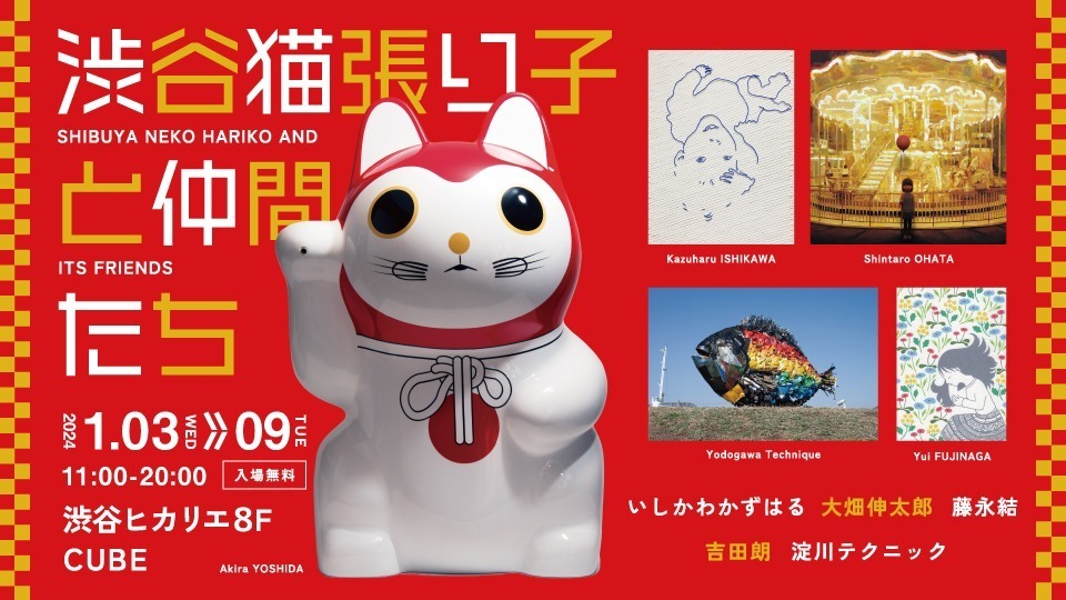 今展は現代美術家のマネジメントを行うユカリアートで活動する いしかわかずはる、大畑伸太郎、藤永結、吉田朗、淀川テクニックの5名によるグループ展です。2025年の会社設立20周年を前に、個性豊かなアーティスト達を改めて多くの皆様に知っていただくために企画しました。そんな折、出品作家のひとり吉田朗の作品「渋谷猫張り子」が無断で改変されるという憂き目にあいました。2023年4月半ばに1万筆を超える署名のおかげで作品を取り戻して以来、7ヶ月。作者本人が黙々と修復作業を続けた結果、この度無事に修復が完了しました!そこで、お正月の展示に蘇った「渋谷猫張り子」のお披露目も兼ねたダブルでおめでたい展覧会を開催することにしました。初日には「渋谷猫張り子」の除幕式、淀川テクニック考案の人気コンテンツ「コラージュ川柳®」のワークショップなど、オープニングイベントも開催。パワーアップした幸運の招き猫や各作家の思いが詰まった作品をご覧いただくことで、皆様の新年の景気づけとなることを願っております。是非、ご来場ください!