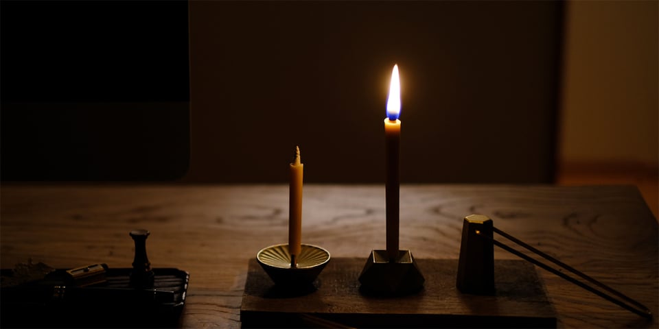 煙がほとんど出ず、香りも少ない植物由来の成分でできた和ろうそく。1914年創業の滋賀県にある和ろうそく専門店「大與(だいよ)」が手がける、櫨と米ぬか2種のろうそくと、「火消し」や真鍮製の燭台など、"あかりまわり"の道具もご紹介します。