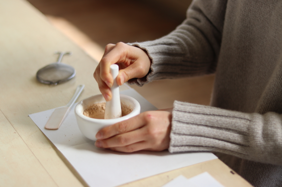 ワークショップでは、自分の肌色に合うよう細かく調整を重ねながら、「セリサイト」を細かく砕いて、パウダータイプのファンデーションかチークパウダーのどちらかを選んでつくります。「セリサイト」製のファンデーションは柔らかい光沢があり、透明感のある仕上がり。また、付け心地も軽く、お肌に優しく馴染んでくれます。