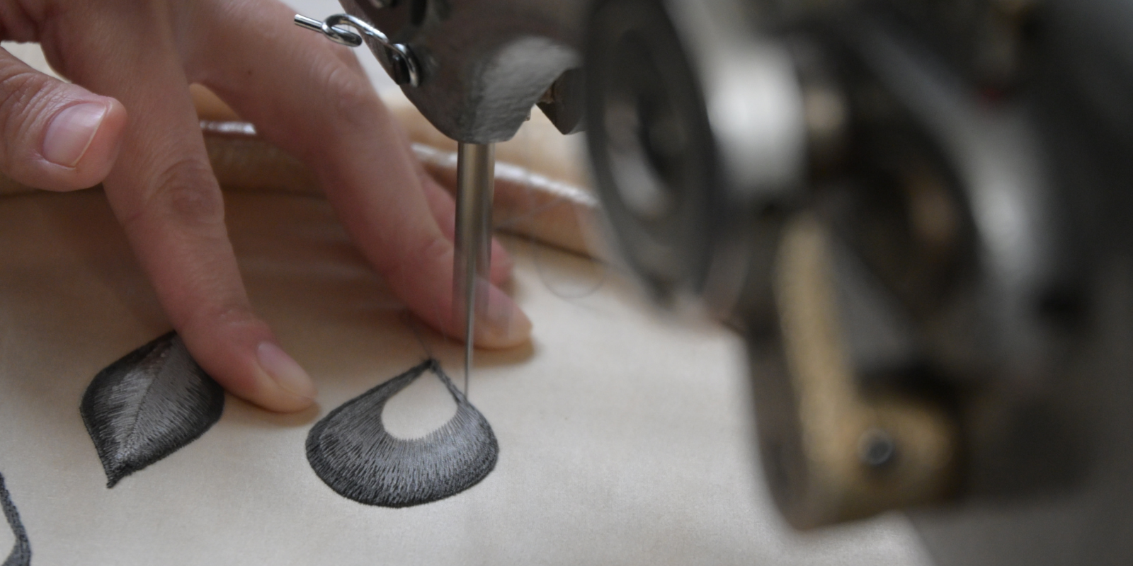 横振り刺繍とは、桐生市の伝統工芸のひとつ。横振り(よこぶり)ミシンを使って制作された刺繍のことです。通常の縫製ミシンとの違いは、布を抑えるパーツがないこと。右膝でレバーを操作して針の振り幅を調整することができます。一度刺繍した後にさらに刺繍を重ねることでまるで絵画のような立体的な表情のある刺繍が生まれます。