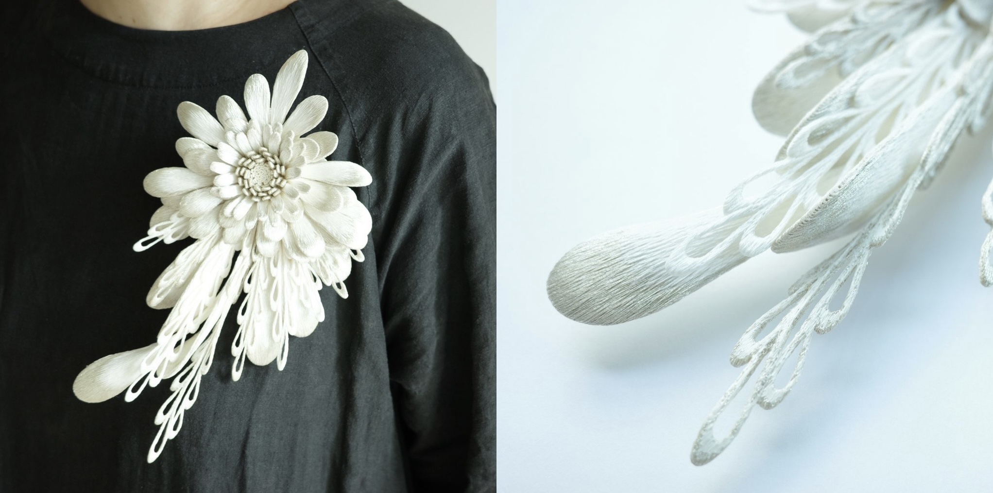 桐生市で生まれ育ち、幼い頃から手仕事や裁縫が身近にあった高澤さんは、21歳の時に横振り刺繍に出会い、まるで楽器を奏でるように布地を動かしながら針で色糸を重ねていく光景にひかれ、横振り刺繍の会社で伝統工芸士の指導のもと3年間修行。その後、独立してブランド「emi takazawa」を立ち上げ、横振り刺繍の技術を活かしたアクセサリーを1点ずつつくっています。