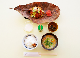 立派な飛騨産のほお葉の「鶏(けい)ちゃん」を主役に据え、「赤カブ漬け」や「煮たくもじ」、「鮒味噌」、「どぶろく」が並びます。岐阜県の食卓の定番、山椒もお好みでピリッと味を引き締めて。岐阜の食が詰め込まれた定食は、2月25日〜4月10日(予定)まで、d47食堂でお召し上がりいただけます。