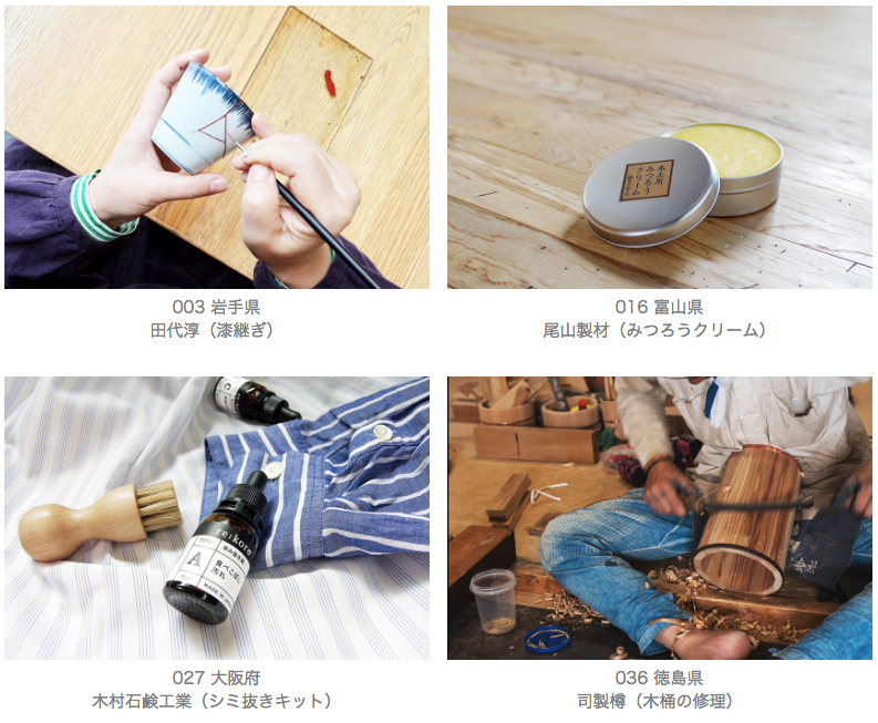 例えば、塗師(ぬし)による割れた陶磁器を漆で直す漆継ぎや、その土地で自生する草木を使った染め直しの受付。また、木工産地メーカーが取り組むまな板の削り直しや、老舗石鹸メーカーの開発したシミ取りキットの販売など、各地の資源、技術、風土と関わりを持ち、私たちの暮らしに関わる修理方法やお手入れの道具を紹介します。