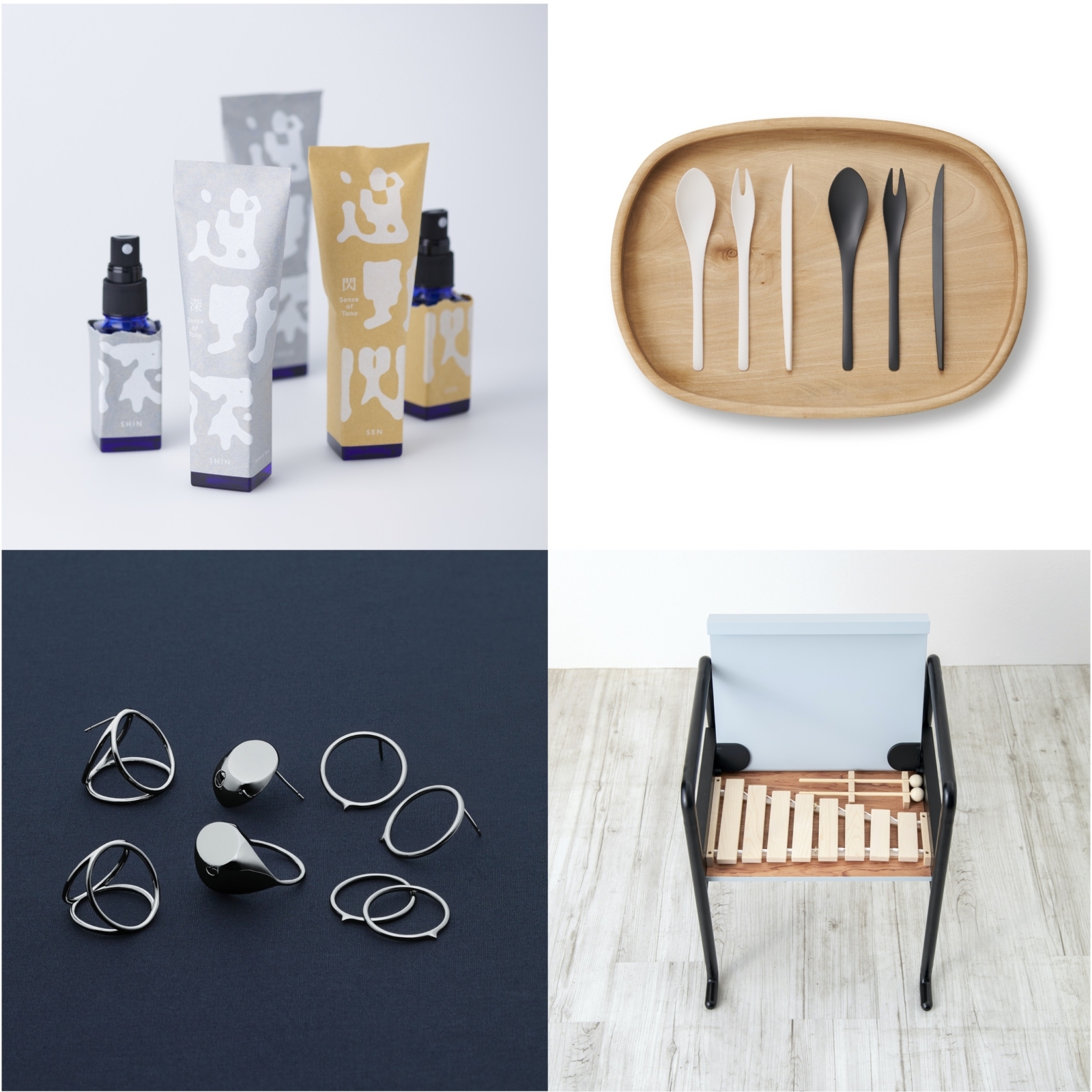左上から時計回りで:遠野が香るアロマスプレー Sense of Tono・TONO MADE(岩手)、KIYO デザートセット・ZIKICO(東京)、XYLOPHONE CHAIR シロフォンチェア・友安製作所(大阪)、suwa megami・suwa megami(長野)
