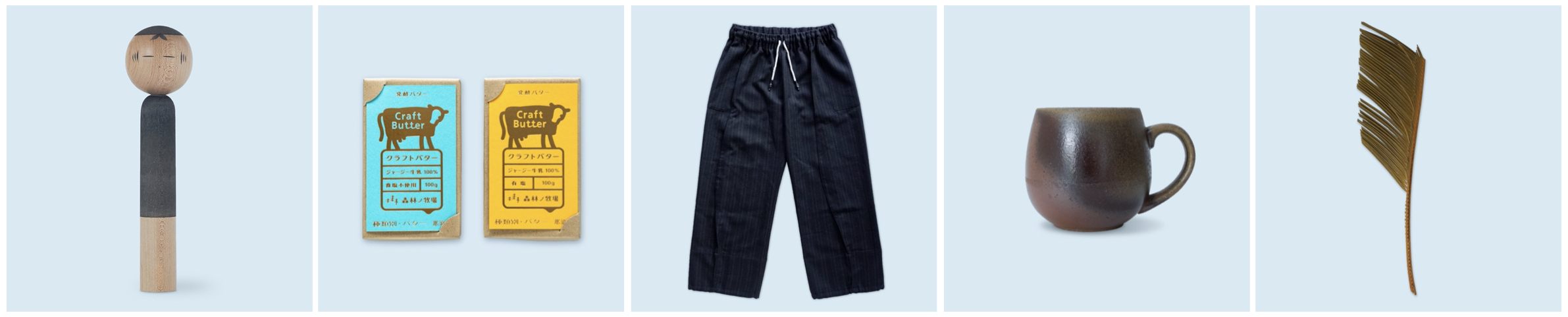 出展品例:宮城|桜井こけし Reflections、栃木|森林ノ牧場 発酵バター、群馬|ふふふ D-pants、岡山|the continue. # 再生備前シリーズ マグカップ、沖縄|島遊舎かぁらんやー ソテツ算