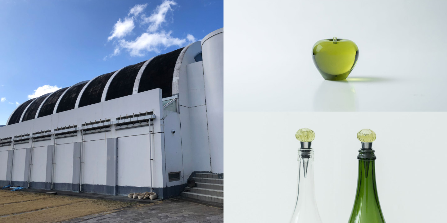 新島ガラスアートセンターは新島の新しい地域文化の育成と産業・観光等の振興・活用を図るために、新島村と新島ガラス協会によって1988年から設置・運営されています。ディレクターの野田収さん、由美子さんが中心となり、新島国際ガラスアートフィスティバルを毎年開催し、国内外からガラス作家を招き、デモンストレーションやワークショップを通してガラスアートを島内外に伝え続けています。今回の企画では、ひねり模様のガラスのコップを製作する際に底に残るガラス玉を再利用したボトルストッパーと、新島ガラス独特の透明度とオリーブ色が美しいりんごのオブジェを販売します。