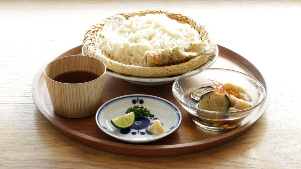 小豆島森本商店の手延べ生素麺と、ちくわの磯辺揚げ。三豊茄子の揚げ浸しの小鉢に素麺をつけて、二度楽しめる。