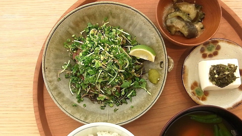 大分定食 りゅうきゅう 1,780円 ぶりの刺身をタレに漬け込み薬味をのせた、郷土料理の「りゅうきゅう」。茄子とゴーヤを味噌で炒めた「おらんだ」と、クロメ豆腐の小鉢。