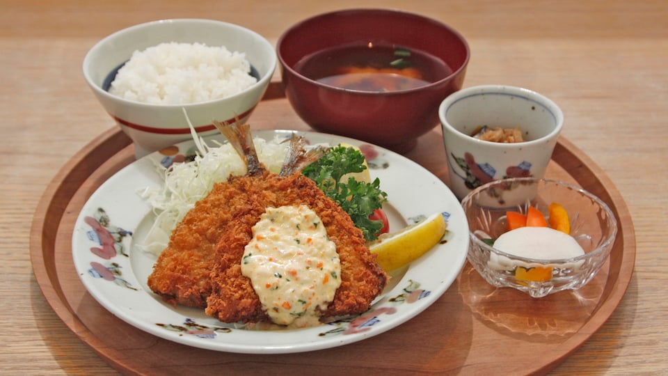 長崎定食 松浦港のアジフライ 1,550円 自家製タルタルソースを添えた長崎県産アジのフライと、ゆで干し大根の煮物の小鉢。