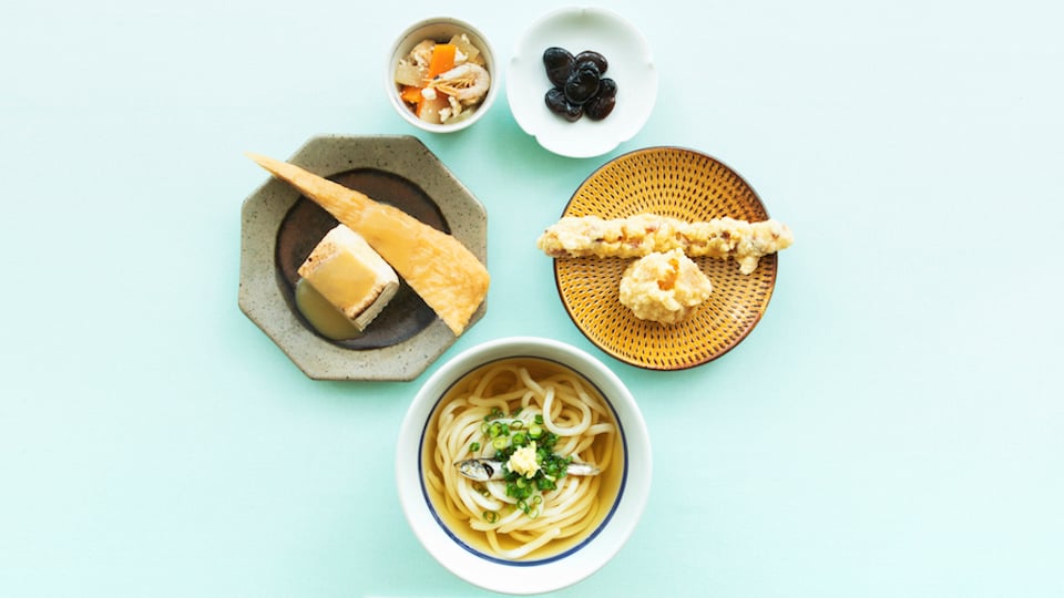 d design travel 香川号 発刊記念関連メニュー 香川定食 1,750円 良質なものだけを手作業で選別する「やまくに」のいりこを使った温かいかけうどん。「しょうゆ豆」は小豆島の木桶醤油と白下糖で味つけ。辛子酢味噌で食べる「てんぷら」と焼き豆腐のおでん。いりこ出汁、干し海老のおかず「雪花」に天ぷら二種盛り。