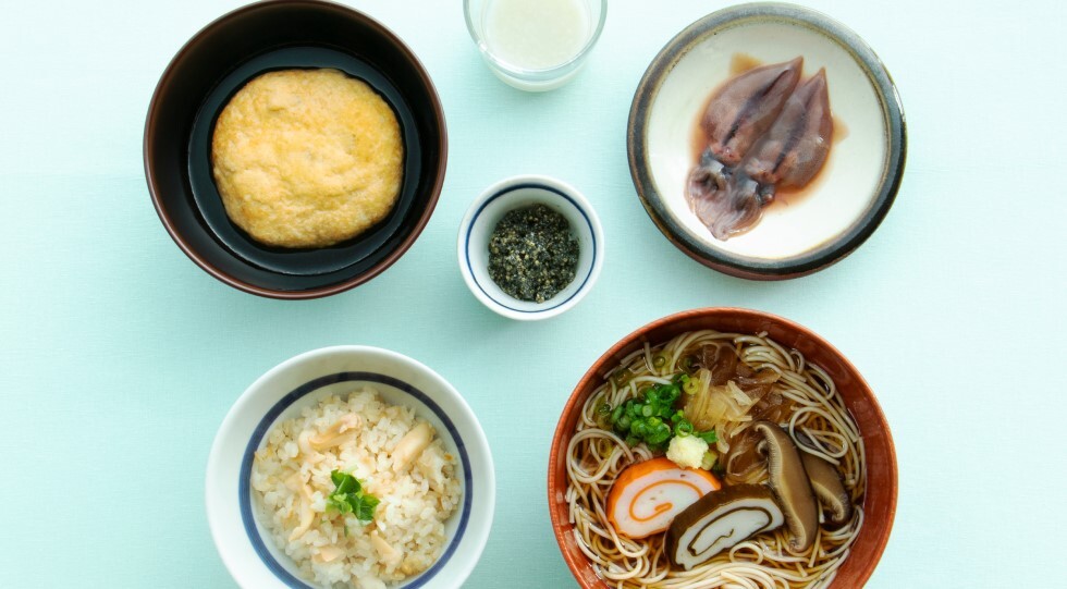 富山定食 2,100円 大門素麺と渦巻蒲鉾、郷土料理のよごし、報恩講料理のまるやま、山と海の食文化を。