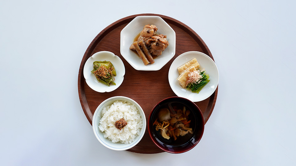 京都定食 鶏の山椒煮と「津乃吉」の佃煮 2,000円 「食べ物は命を繋ぐもの」として素材を活かしきる京都・津乃吉の味を楽しめる一膳。鶏と根菜の山椒煮、万願寺唐辛子の炊いたん、壬生菜のおひたし、京だしのお吸い物。