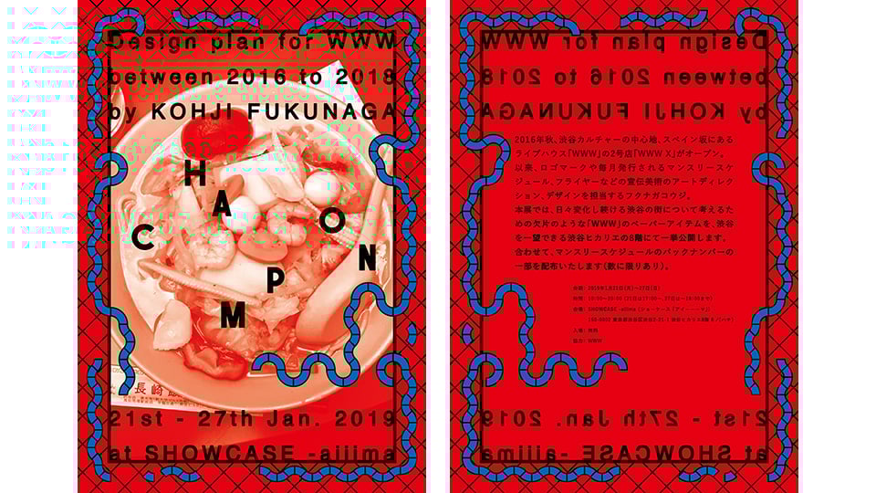 2016年秋、渋谷カルチャーの中心地、スペイン坂にあるライブハウス「WWW」の2号店「WWW X」がオープン。 以来、ロゴマークや毎月発行されるマンスリースケジュール、フライヤーなどの宣伝美術のアートディレクション、デザインを担当するフクナガコウジ。 本展では、日々変化し続ける渋谷の街について考えるための欠片のような「WWW」のペーパーアイテムを、渋谷を一望できる渋谷ヒカリエの8階にて一挙公開します。 合わせて、マンスリースケジュールのバックナンバーの一部を配布いたします(数に限りあり)。
