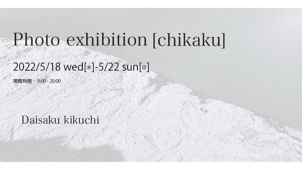 chikaku EVENT chikaku 会 期 2022年5月18日(水) - 2022年5月22日(日) 時 間 09:00 - 20:00 場 所 Creative Lounge MOV aiiima1&2 写真家菊地大作の銀塩写真の展示です。オリジナルプリントを是非生で見てください。 菊地大作 1975生まれ http://daisakukikuchi.tumblr.com