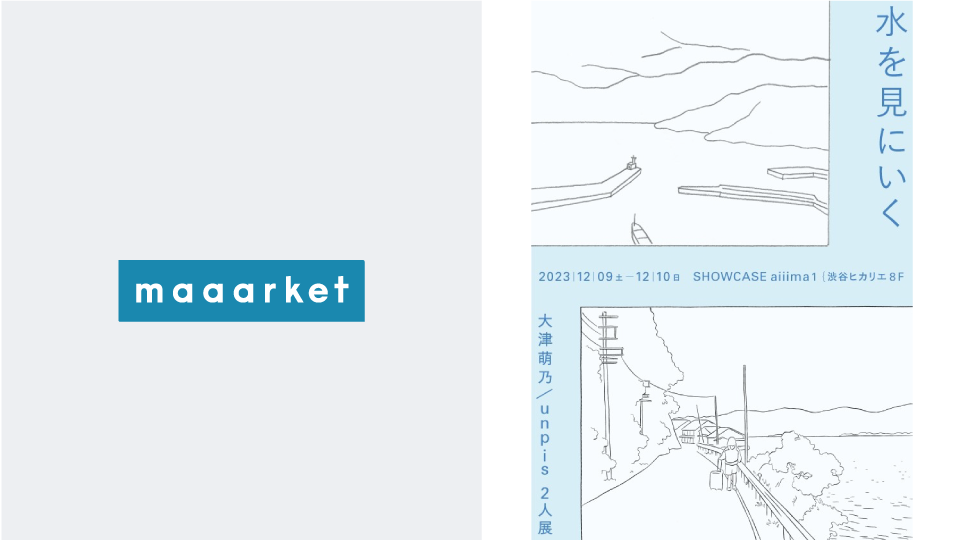 《aiiima maaarket》大津萌乃・unpis 2人展『水を見にいく』 EVENT 《aiiima maaarket》大津萌乃・unpis 2人展『水を見にいく』 会 期 2023年12月 9日(土) - 2023年12月10日(日) 時 間 13:00 - 18:00 *12/9 Sat. 13:00-21:00, 12/10 Sun. 9:00-18:00 場 所 Creative Lounge MOV aiiima1 unpis / 大津萌乃