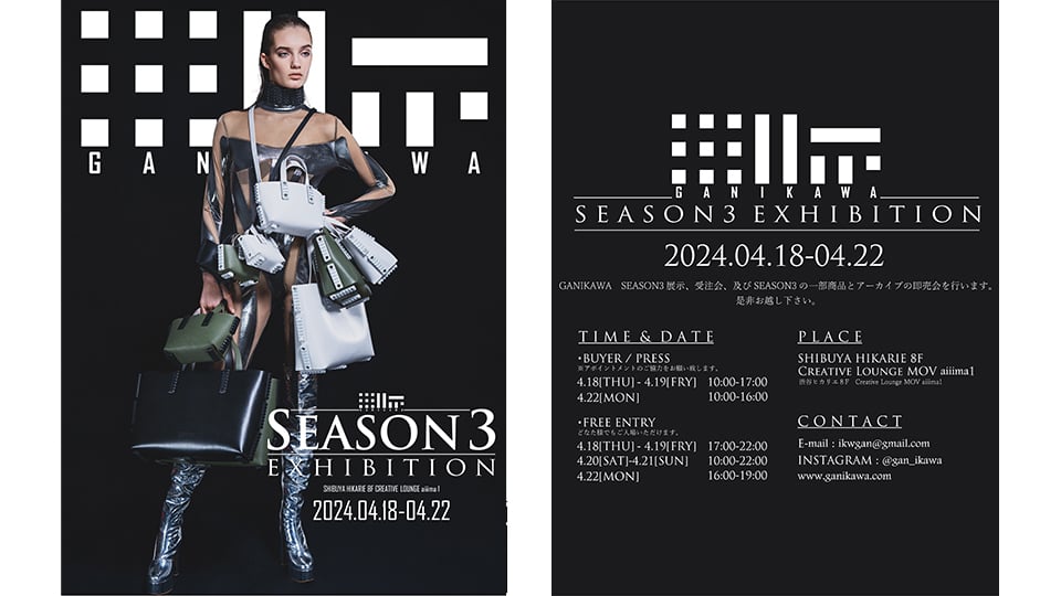 GANIKAWA SEASON3 展示・受注会を開催、及びSEASON3一部アイテムとアーカイブの即売会も行います。