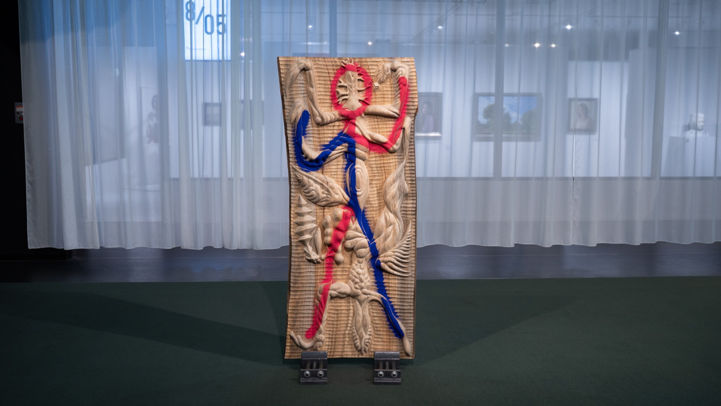 トーテムポールを連想させる作品は、下部に複数の四角い箱型の木枠が連なり、上部には人物の顔や手足、縄や葉のようなモチーフが配置されています。顔料を用いたペイントや髪の毛のような繊維、ポップな色合いの布地、セラミックなど、木とは異なる素材が用いられ、それぞれの特性を活かしながらバランスを保つように構成されています。